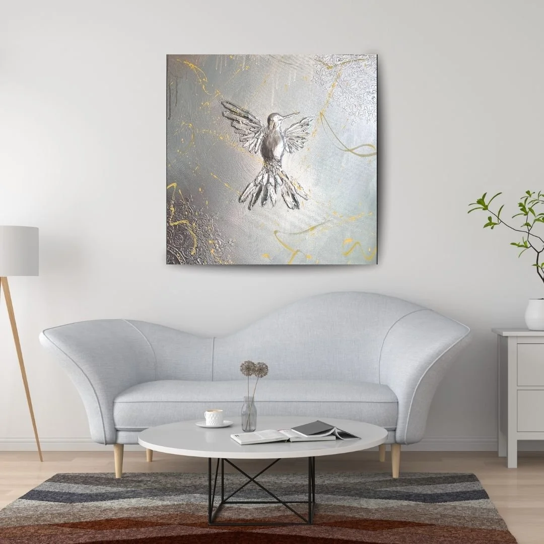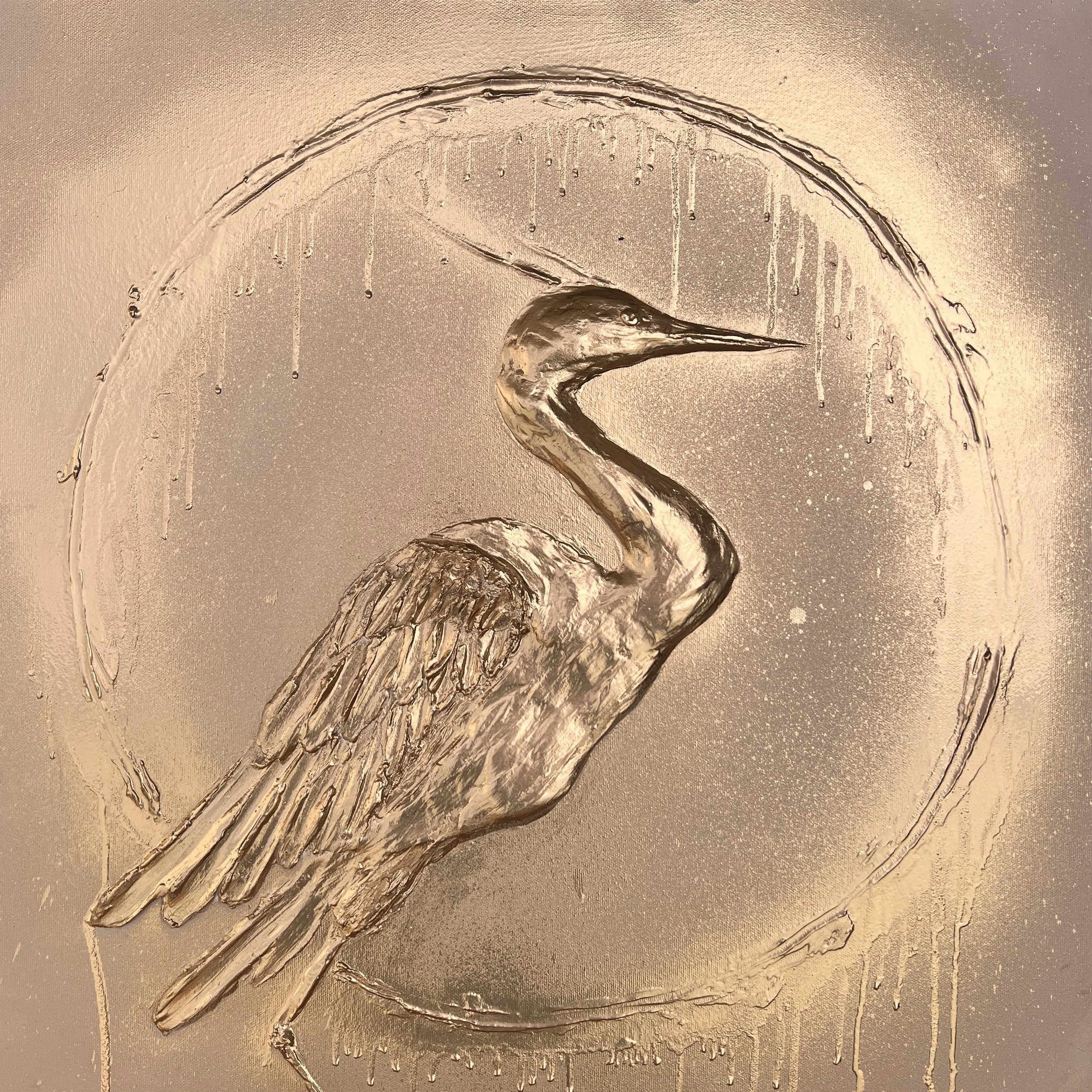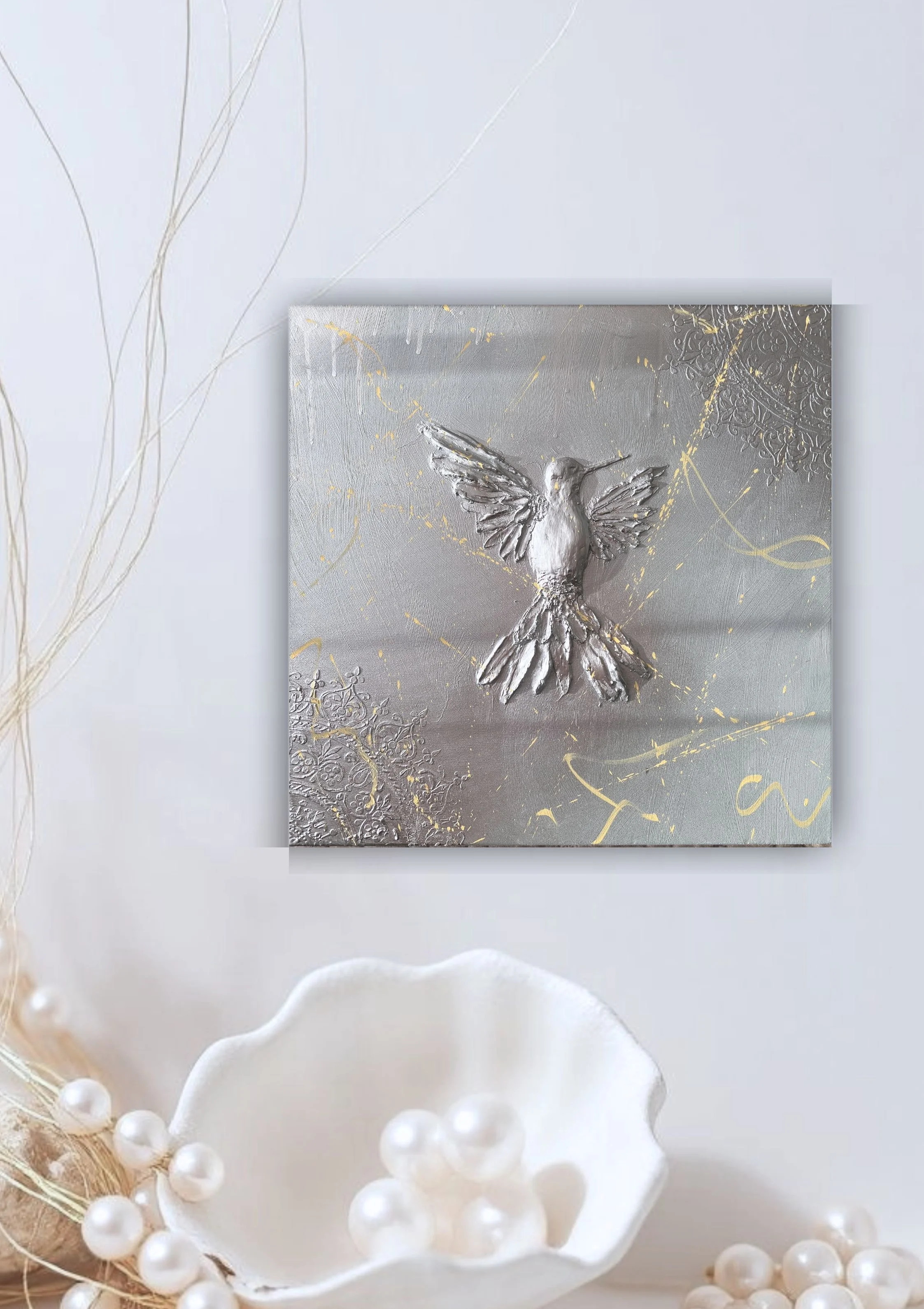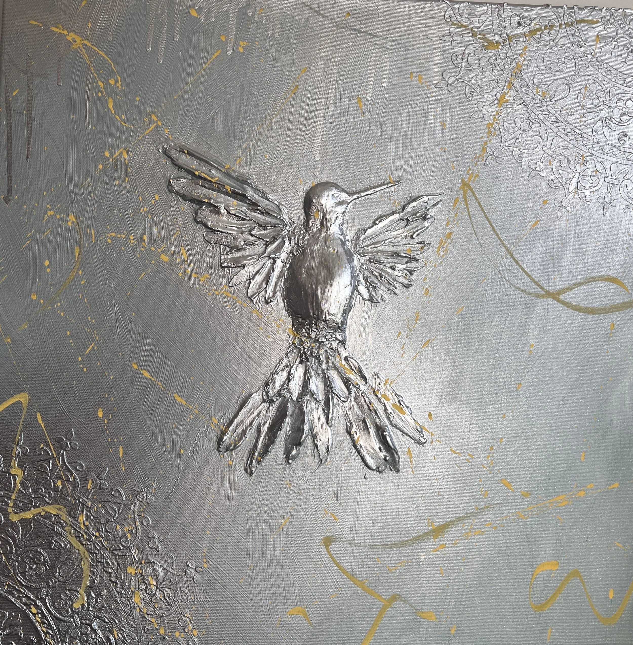Kombinovaná technika, akryl, metalic silver sprej, signováno na rubové straně, lakováno UV lakem Schmincke (DE)