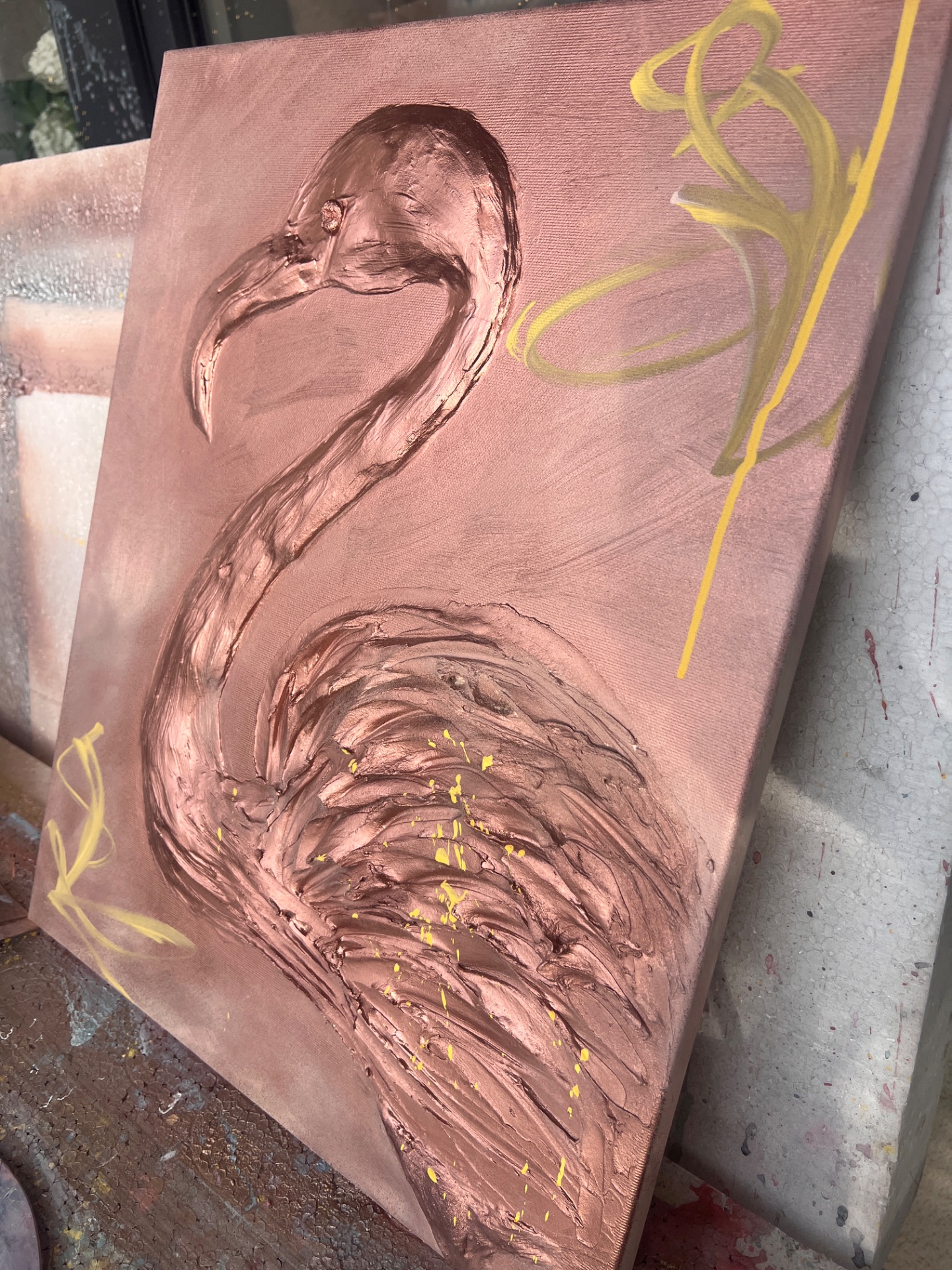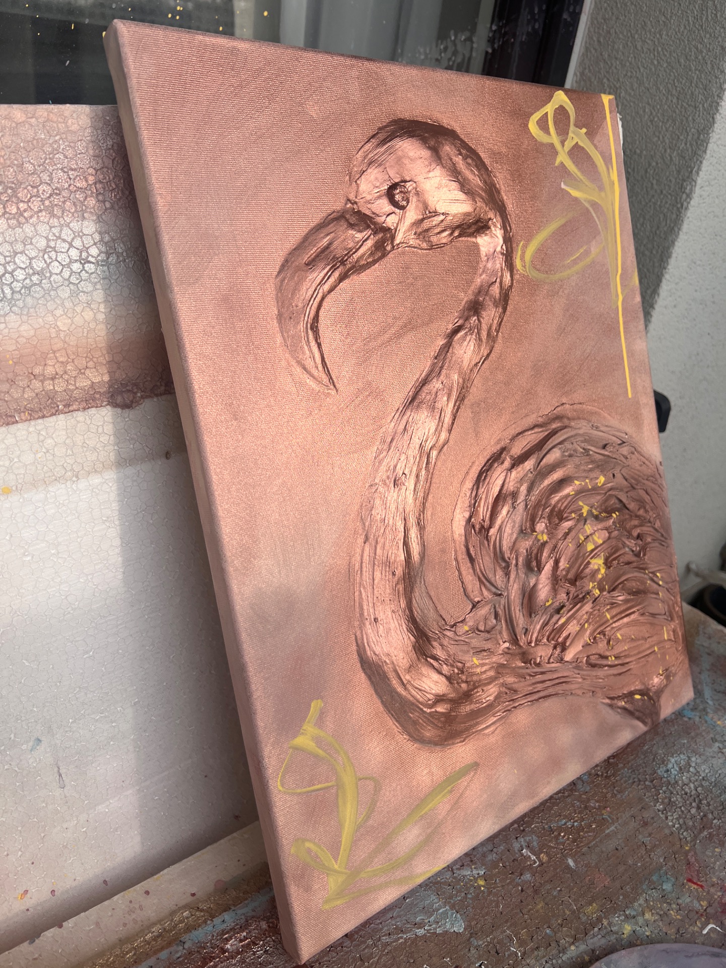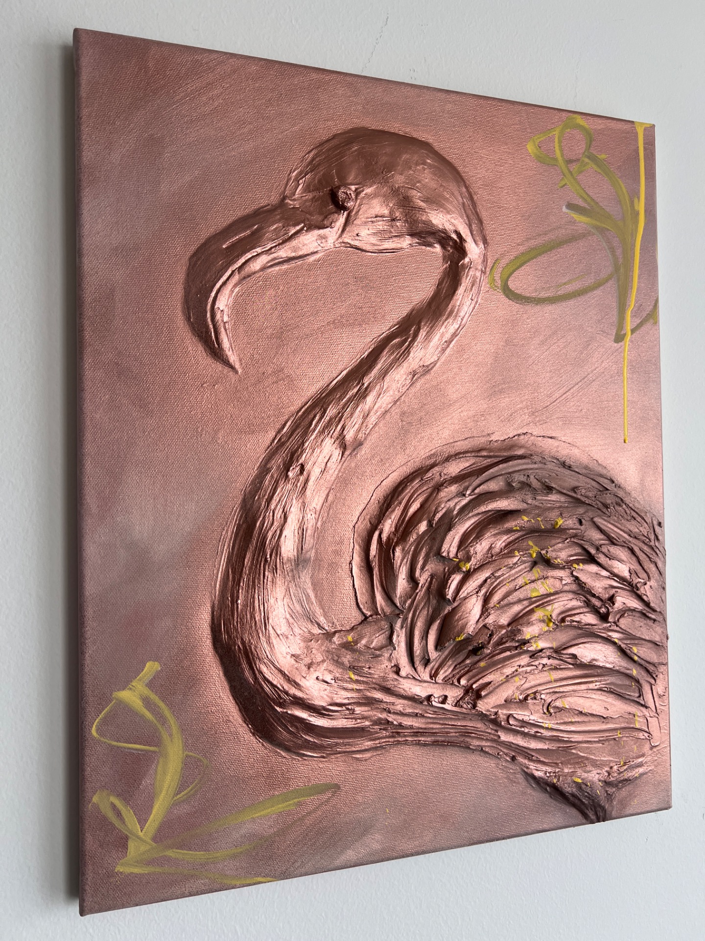 Autorský obraz plameňáka není jen malbou, ale díky vysokému reliéfu téměř sochou na plátně. Obraz během dne neustále mění svou tvář. Každý tah špachtlí je unikátní a dává dílu nezaměnitelnou energii a hloubku.