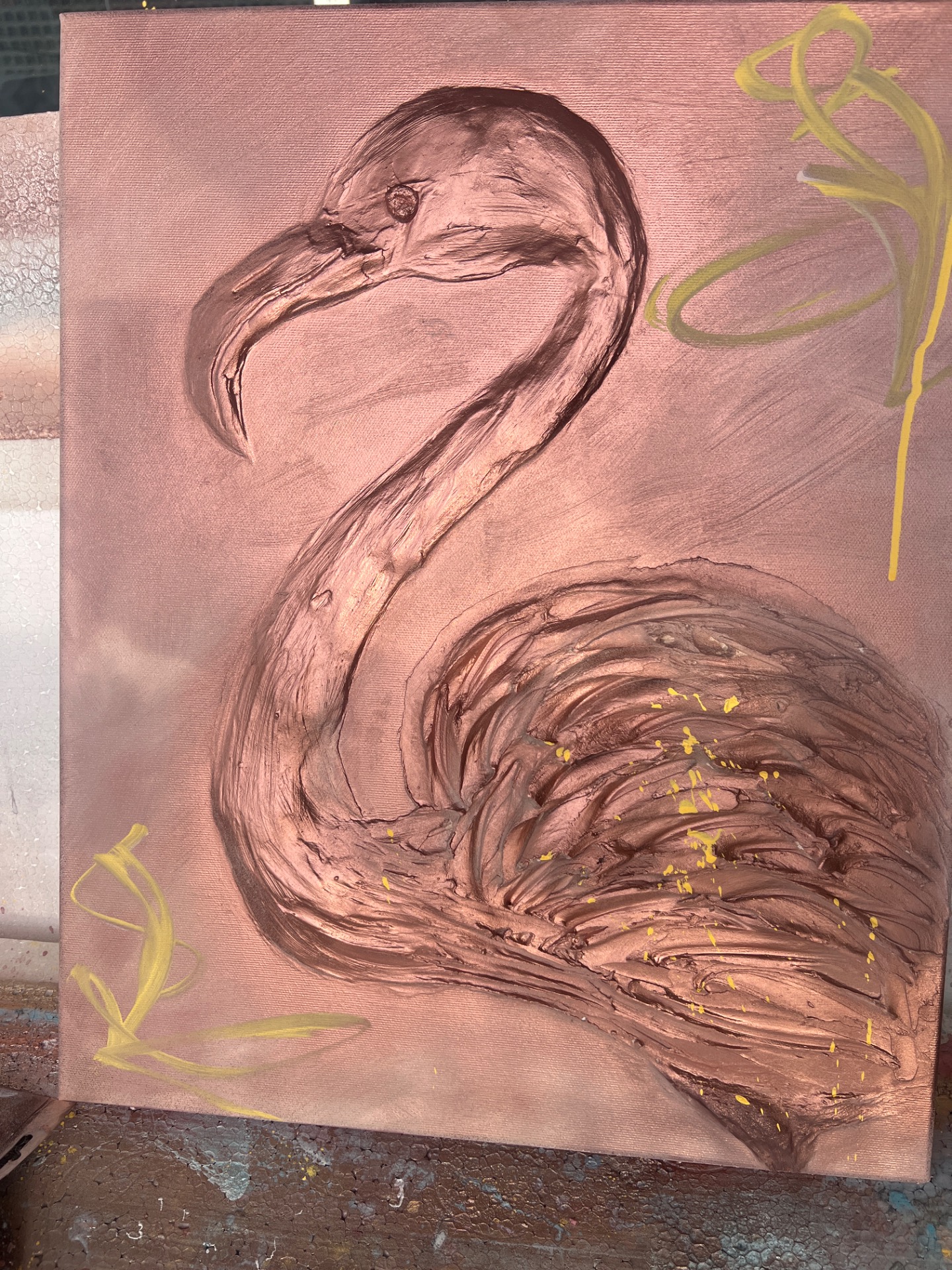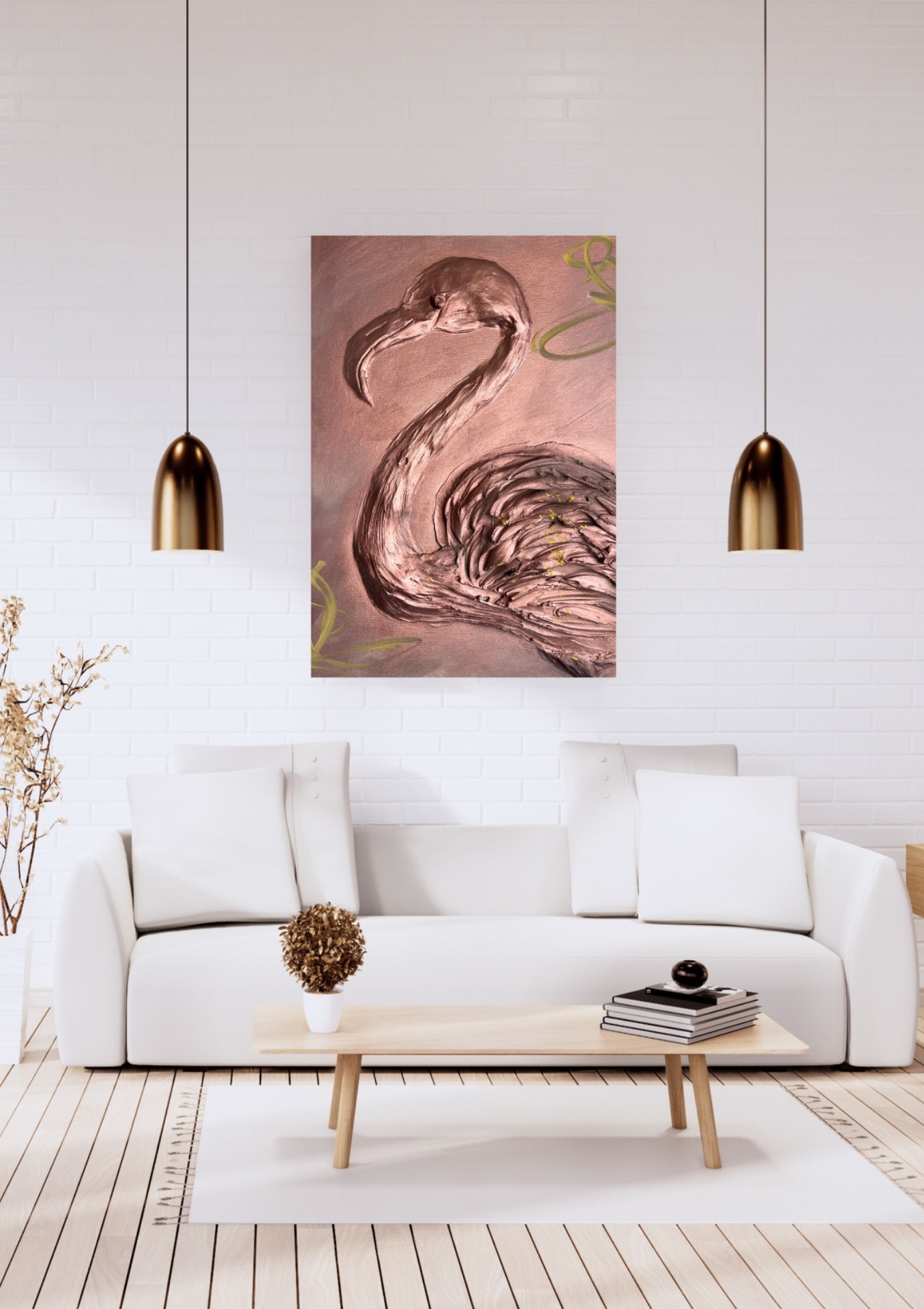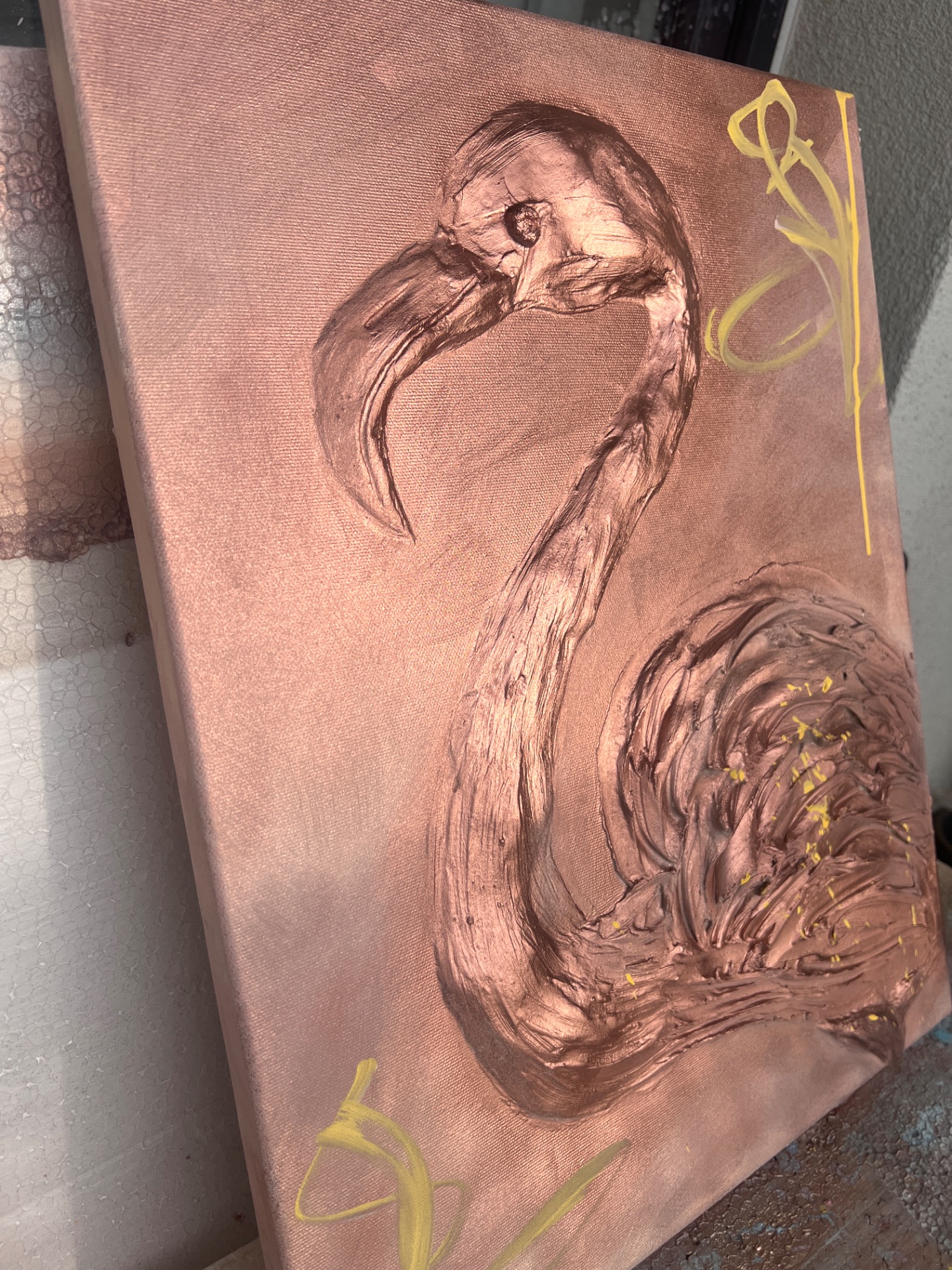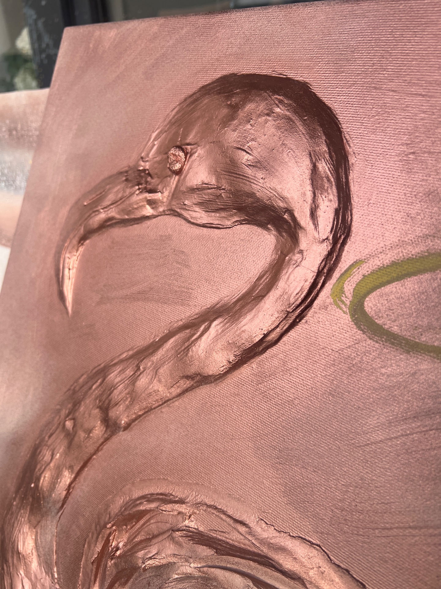 Autorský obraz plameňáka není jen malbou, ale díky vysokému reliéfu téměř sochou na plátně. Obraz během dne neustále mění svou tvář. Každý tah špachtlí je unikátní a dává dílu nezaměnitelnou energii a hloubku.
