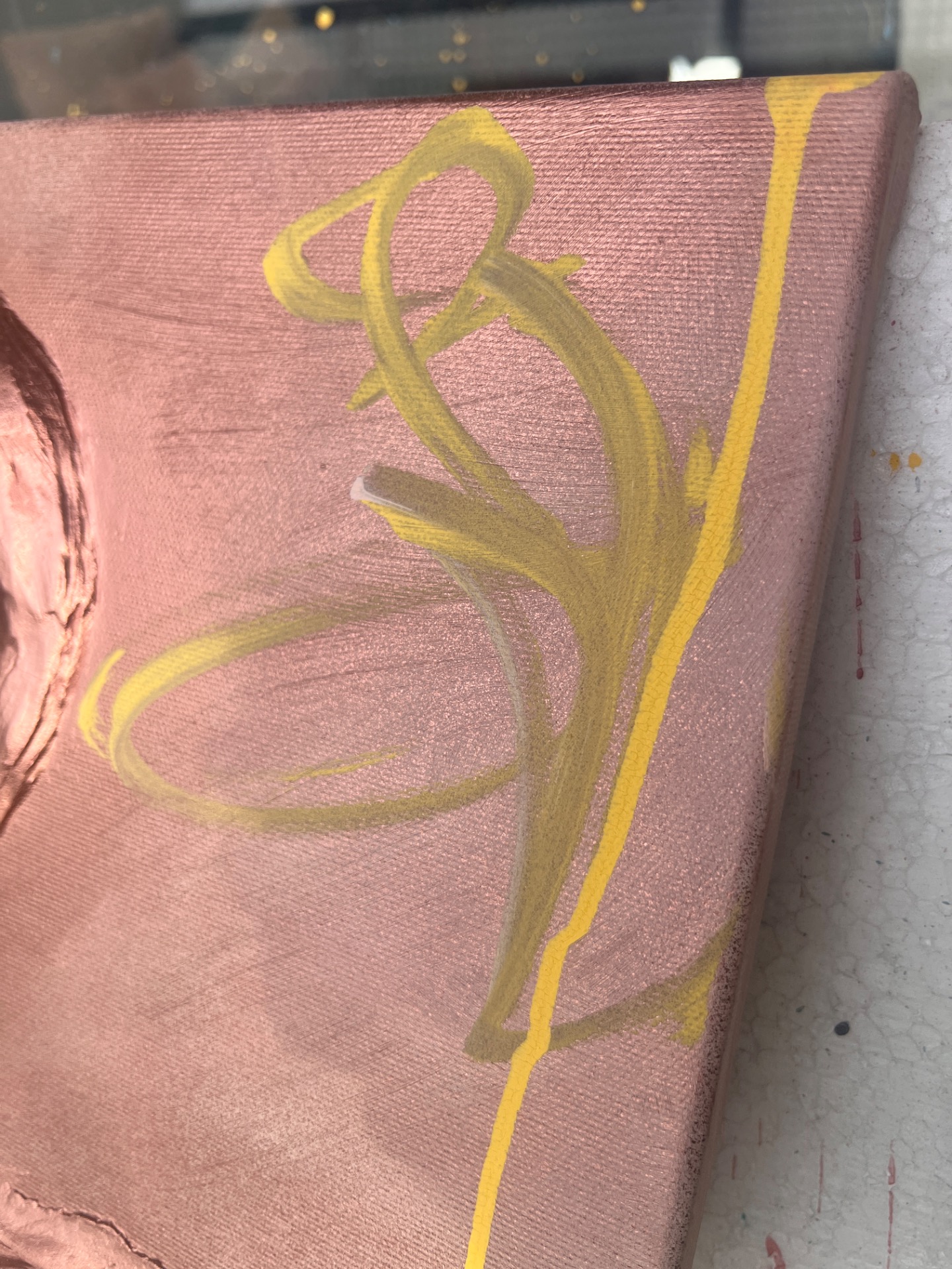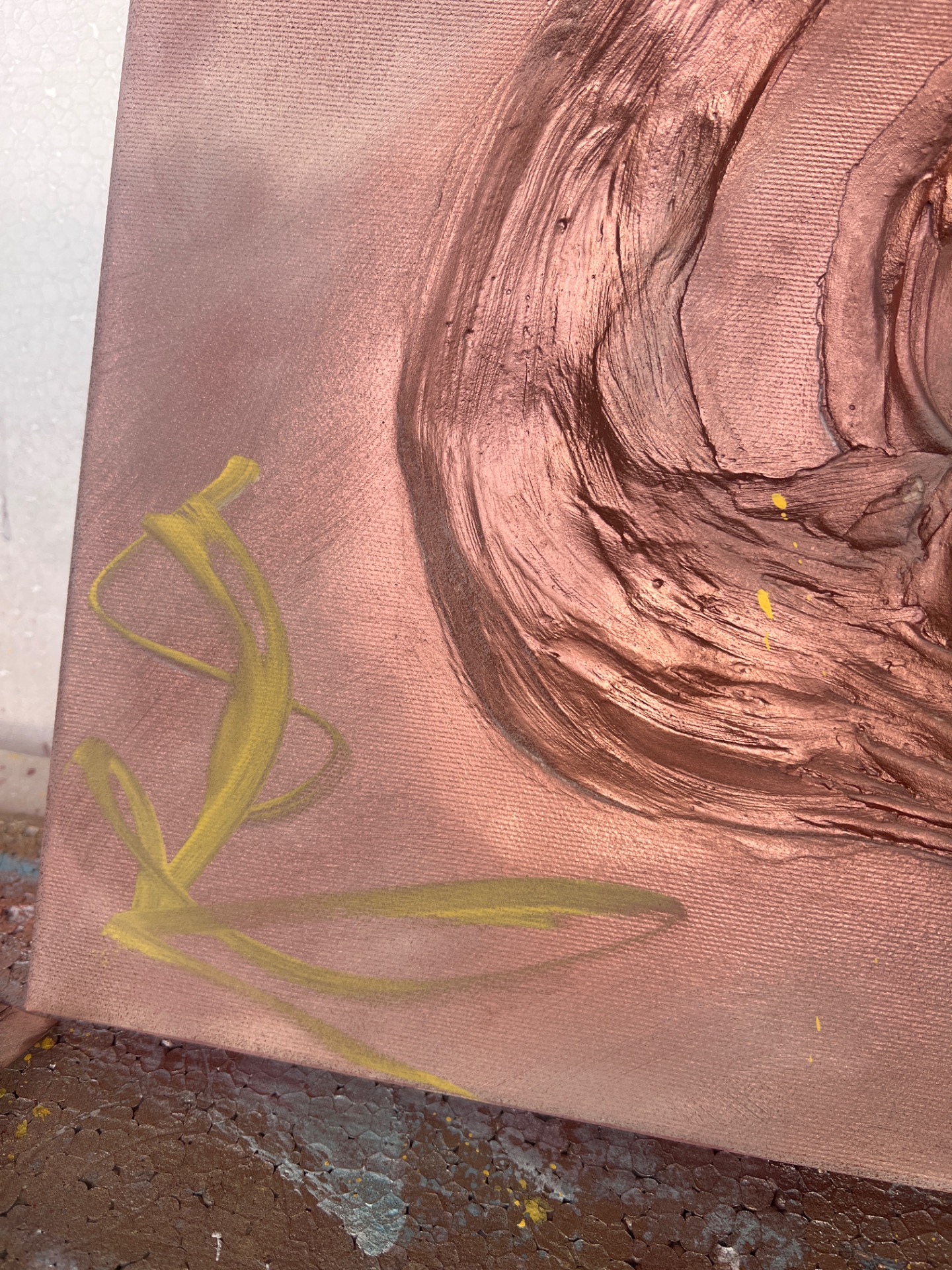 Kombinovaná technika, akryl, metalic rosegold sprej, signováno na zadní straně, lakováno